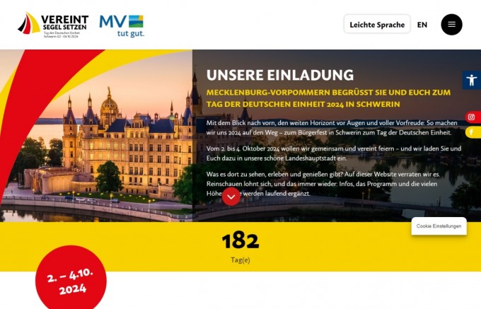 Vom 2. bis 4. Oktober 2024 begrüßt Mecklenburg-Vorpommern in Schwerin seine kleinen und großen Gäste zum Bürgerfest am Tag der Deutschen Einheit. Was es dort zu sehen, erleben und genießen gibt? Auf der Webseite tag-der-deutschen-einheit.de finden Sie bereits jetzt Infos zum Programm und zu den vielen Höhepunkten. Diese werden laufend ergänzt. Immer wieder reinschauen lohnt sich also!