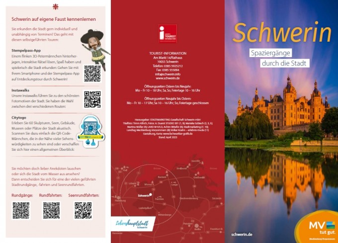 Ein neues Faltblatt nimmt Urlauberinnen und Urlauber jetzt mit auf einen bzw. mehrere Spaziergänge durch die Stadt. Neben einer Empfehlung für einen Rundgang auf den Spuren der 1.000-jährigen Geschichte Schwerins - vom Schloss durch die Altstadt bis zur Schwimmenden Wiese - finden Gäste in dem Flyer einen Stadtplan sowie Infos zu geführten und digitalen Stadtrundgängen. Das Faltblatt ist in einer Auflage von 20.000 Stück erschienen und wird sowohl in der Tourist-Information Schwerin, als auch in Wismar und Lübeck verteilt.