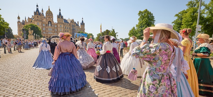 Am 29. Juni wird in Schwerin wieder am Rad der Zeit gedreht. Das Historische Schlossfest im Rahmen des Schlossfestwochenendes entführt Sie und Ihre Gäste für einen Tag an den Hof Friedrich Franz II. Mehr als 150 Mitglieder des Schweriner Schlossvereins und weitere Teilnehmende schlüpfen an diesem Tag in historische Kostüme und lassen das Jahr 1857 wieder aufleben. Dazu hat der Schlossverein ein umfangreiches Programm zusammengestellt. Auf welche Aktionen und Vorführungen Sie sich an diesem Tag freuen können, erfahren Sie auf der Webseite zum Historischen Schlossfest. Tickets für diesen Tag gibt es unter anderem hier im Online-Vorverkauf. Abends erwartet Sie dann die Lichtshow "Son et Lumière" mit der neuen, modernen Inszenierung "Sound of Germany" (Klick für mehr Infos).